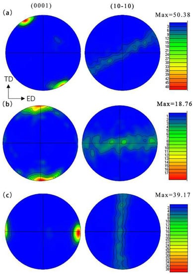 Pole figures on the TD–ED cross-section of (a) ECAP 4P alloy, (b) ECAP 8P alloy, and (c) ECAP 12P alloy.