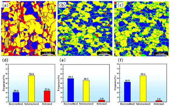 Different types of grains and their frequencies in (a,d) ECAP 4P alloy, (b,e) ECAP 8P alloy, and (c,f) ECAP 12P alloy.