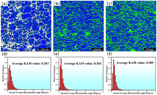 KAM maps and KAM distributions in (a,d) ECAP 4P alloy, (b,e) ECAP 8P alloy, and (c,f) ECAP 12P alloy.
