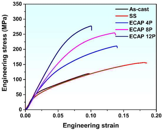Typical engineering stress–strain curves of as-cast, SS, and ECAP alloys.