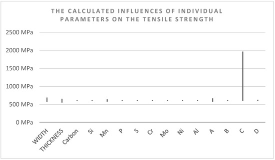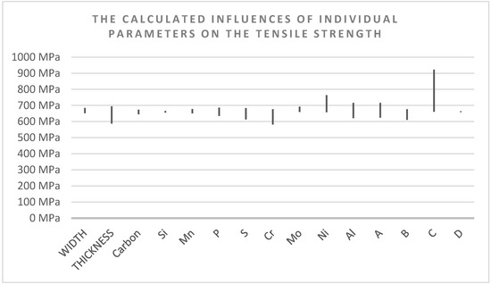 In addition, the influences of individual parameters on the tensile strength while separately changing individual parameter within the individual parameter range were calculated (Figure 2). It is possible to conclude that according to linear regression results, the most influential are silicate type inclusions (C).