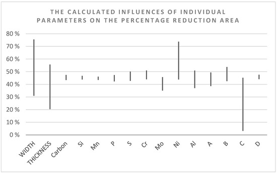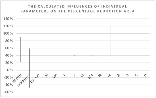 Moreover, the influences of individual parameters on the percentage reduction area while separately changing individual parameter within the individual parameter range were calculated (Figure 5). It is possible to conclude that according to linear regression results the most influential are hot rolled bar width (WIDTH) and thickness (THICKNESS), nickel content, and silicate type of inclusions (C).