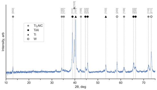 Higher functional characteristics of the TiAl IMCs can be achieved by further alloying them with other metals, and tungsten is one of these metals. Materials of the Ti-Al-W system are distinguished by increased mechanical properties, stability [33,34,35], and high-temperature creep strength [36,37,38,39] since W works both as dispersion, strengthening particles on a microlevel, and participates in diffusion processes and prevents the propagation of dislocations at the atomic level. Another phase for improving the properties of TiAl is TiAlC, which is also known as one of the MAX-phases [40,41]—a family of the ternary carbides and nitrides with the general formula MAX (n = 1, 2, 3, 4), where M stands for early transition metal (such as Sc, Ti, Zr, Hf, V, Nb, Ta, Cr, Mo), A represents elements from groups IIIA and IVA in the periodic table, and X is C and/or N [42]. The formation of a TiAlC phase is possible during the formation of Ti-Al intermetallics in carbon-containing systems, where the TiAlC phase can increase the mechanical properties and oxidation resistance of a system [43,44,45,46,47,48,49].