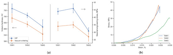 Vickers microhardness and maximal engineering stress (a) of the samples after vacuum sintering and hot isostatic pressing (HIP), and stress–strain curve of the HIP samples (b).