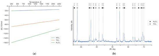 Gibbs free energy change (G) for TiO [68], AlO [68], and WO [69] as function of temperature (K) (a) and XRD spectrum of the TAW2 sample surface after 660 min of oxidation at 900 °C (b).