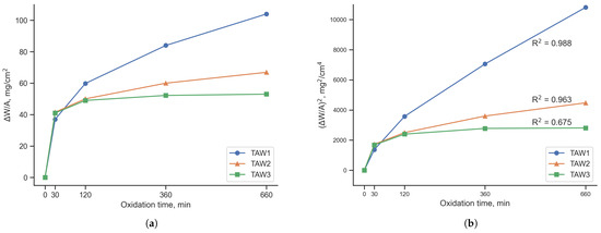 The dependence of the squared mass gain on time is close to linear for all samples. The closest to linear dependence is for TAW1 (R = 0.988), and the least for TAW3 (R = 0.675). For TAW1 samples, the classical parabolic oxidation law [77] is realized; in the remaining samples, oxidation proceeds according to a mixed mechanism. The K value for TAW1 samples is 212.6 gcmmin, which is 12 times higher than for TAW2 samples (17.7 gcmmin) and 90 times higher than for TAW3 samples (2.3 gcmmin).