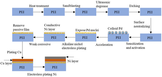 Some approaches could be used to prepare a metallic layer on the polymers, such as physical (PVD) [6,7] and chemical vapor deposition (CVD) [8,9], the use of thermal [10] and cold spray [1,11], using electroless plating [12,13,14], and electroplating a conductive layer [15]. PVD, CVD, and spray techniques incur high equipment and processing costs, and are limited in terms of productivity and workpiece sizes and shapes. Electroless plating is an alternative way to produce the metallic layer on PEI composite substrates when plating without applied current and vacuum conditions or using a low bath temperature, and has applicability to complicated-shaped substrates [16,17,18,19]. Electroless nickel plating on polyethylene terephthalate surfaces for triboelectric nanogenerators facilitates the improvement of device wearability and comfort [20]. Marques-Hueso et al. [21] reported that a rapid photosynthesis method was used to produce the silver nanoparticles on PEI substrates. Marline et al. [22] studied a direct metallization of Ni coating on PEI substrates by spin-coating or a dipping deposition of an ultra-thin film of an organic nickel salt in an alcoholic solution. Jones et al. [23] investigated a direct metallization of PEI substrates by activation with metal ions as seed layers, which could be reduced and formed by chemical or optical reduction. Alodan [24] reported a metallizing PEI resin reinforced with glass fibers, where the surface of the PEI substrate was modified by etching the resin matrix and the glass fibers using two different solutions. During the resin etching step, glass fibers were exposed and etched at the surface. Glass fiber etching was found to be essential to promote adhesion between the metallic film and the PEI surface. After electroplating, the adhesion force was 230 kg/cm2 (3000 psi). Esfahani et al. [2] presented a new digital fabrication strategy that combined the 3D printing of high-performance polymers (polyetherimide) with a light-based selective metallization of copper traces through the chemical modification of the polymer surface and the computer-controlled assembly of functional devices and structures. Zhang et al. [25] reported that a new surface modification method was developed for the electroless deposition of robust metal (copper, nickel, silver, etc.) layers on a poly(dimethylsiloxane) substrate with strong adhesion.