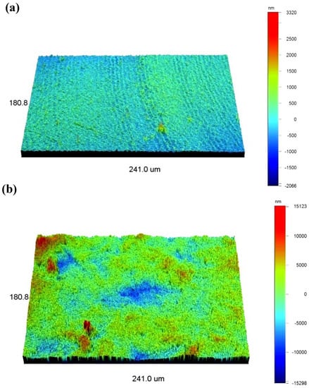 Figure 3 displays the 3D images of the surface morphology of the PEI substrate before and after the sandblasting process. The average surface roughness (Ra) values of the surface of the PEI substrate before and after sandblasting were 117 nm and 2125 nm, respectively. The surface roughness increased significantly after the sandblasting process. The surface of the PEI substrate was smooth (Figure 3a); however, the surface of the PEI substrate after sandblasting looked like a “mountain chain” (Figure 3b), indicating the surface became rough, which could contribute to improving the adhesion of the layer and the PEI substrate.