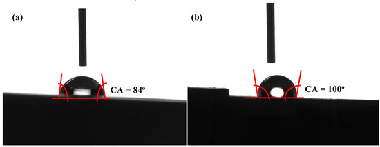 The effect of sandblasting on the wettability of the PEI substrate is observed in Figure 4. The surface of the PEI substrate before sandblasting shows a high wettability at a contact angle of about 84° (Figure 4a). After sandblasting, the contact angle increased to 100° (Figure 4b), indicating a low wettability. The specific surface area significantly increased after sandblasting process. The calculated surface energies of the PEI substrates before and after sandblasting were equal to 34.3 mJ/m2 and 60 mJ/m2, respectively. This indicated that the specific surface area significantly increased after the sandblasting process. The Wenzel and Cassie models contributed to the effect of surface roughness on wettability. The Wenzel model shows that a rough material surface has a higher surface area than a smooth one, which increases its hydrophobicity. The Cassie model shows that air trapped on the rough surface enhances the hydrophobicity because the drop is partially sitting on air. According to Equations (4) and (5), the ratio R is greater than unity, thus the wettability increases (* <) for a hydrophilic situation, and decreases (* > ) for a hydrophobic one. Therefore, this result agrees with the Wenzel equation. However, the surface wettability of the PEI substrate after sandblasting pretreatment can be improved to some degree after the chemical etching process. A good surface wettability of the PEI substrate can enhance the absorption of the activated Pd species in an activation solution. Therefore, more activated Pd particles were fixed and attached at the top-wetted surface, resulting in the increase of surface reactive sites. It can be inferred that the adhesion of the Ni layer was enhanced by the increase of the surface reactive sites.