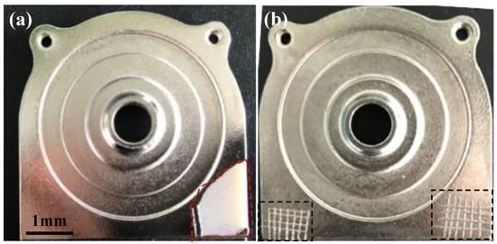 Digital images of Ni/Cu/Ni multilayer deposits on PEI substrates without (a) and with (b) sandblasting process after cross-cut test by 3M tape.