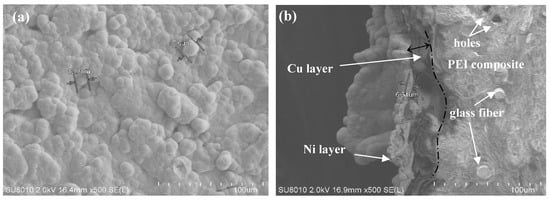 Figure 7 shows the microstructure and morphology of the surface and fracture of the Ni/Cu/Ni multilayer on the sandblasted PEI substrate. The visual appearance was a continuous and homogeneous layer with a low presence of visible defects (Figure 7a). There is a continuous film. The globular shape of the top of the columnar features can be observed. However, the top-surface of the Ni layer was also composed of some small aggregates with sizes of 2.0~8.0 μm. The surface was relatively rough due to the rough surface of the PEI substrate. The fracture of the multilayer on the PEI composite is displayed in Figure 7b, which was treated by a mechanical cutting machine. The thickness of the top-surface Ni layer was about 6.31 µm. The thickness of the Cu interlayer was about 20 µm. Glass fibers and some holes were observed on the fracture of the PEI substrate. After the sandblasting process, the surface generates a non-uniform surface structure characterized by dimples and furrows. There were no noticeable cracks, and this behavior demonstrated a high-quality composite multilayer. There is no evidence of the delamination between the layers and the deposit and the substrate.