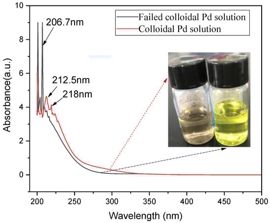 The colloidal palladium solution will fail. After a period in the beaker, the color of the solution will be changed to yellow. There is no deposit formed in the solution. Figure 8 shows the UV–vis spectra and macrograph of the activation solution in the glass bottles. It can be observed that the colloidal palladium solution shows the gray dark color; however, the color of the colloidal palladium solution became yellow after a period (about 10 days exposed to air). According to the observation of the UV–vis spectra, the chemical state of the ions in the solution was changed after 10 days exposed to air. This is possible due to the oxidization of Sn2+ ions, as in the following reaction (7):