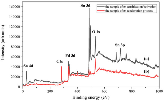 XPS spectra of top-surface of the sample after sensitization/activation process (a) and after acceleration process (b).