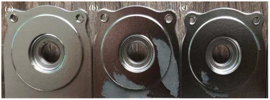 Digital macrographs of PEI samples: (a) standard condition (4 min), (b) short acceleration time (2 min), (c) excessive acceleration time (10 min).
