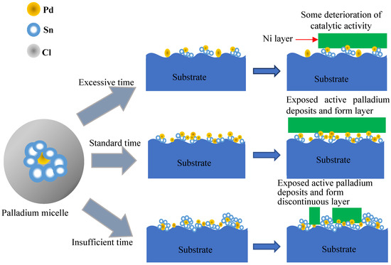 As displayed in Figure 12, colloid Pd mainly comprised Pd as the activation core and Sn and Cl as a protective shell core [38]. Firstly, the colloidal nucleus selectively adsorbed the Sn2+ and Sn4+ ions in the solution to form a dense layer. The colloidal Pd-Sn nanoparticles were formed with a Pd nucleus as the core, and Snn+ as the shell core. Then, the colloidal Pd-Sn nanoparticles with a positive charge would absorb the Cl− ions with a negative charge for neutralization. A ring of encirclement was generated around the colloidal Pd-Sn nanoparticles in order to protect the Pd core. Therefore, the electrically neutral colloid Pd was obtained in the form of PdxSnyClz or {Pdm·2Snn+·2(n − x)Cl−}·2xCl− complexes [40]. After acceleration, the chemical nature of the adsorbed species was also addressed in previous research [29,31]. Cohen and Meek [41] discovered that Sn4+ in the form of stannic hydroxide was found before the acceleration process, and that both Sn(OH)4 and Pd-Sn alloys were present after acceleration. Osaka et al. [42] examined catalyzed surfaces and reported that a Pd–Sn alloy was formed with the removal of Sn4+ ions during acceleration. Burrell et al. [36] reported that only Sn4+ was found before acceleration, and both metallic Sn and Sn4+ were present after acceleration; furthermore, he found that metallic Pd0 was primarily present before and after the acceleration process. Pd2+ species from a PdCl2 solution were attached on the PEI surface and, subsequently, Pd2+ species were reduced into Pd0. The Pd0 catalyst allowed an instantaneous initiation of the Ni deposit by immersion in a plating bath. After the standard acceleration time, the masking salts are leached away and exposed the active Pd or the metallic PdSnx, which is then able to initiate the deposition of the Ni layer, forming a conductive layer. However, if the acceleration time after the sensitization/activation process is too long or short, it could influence the deposition of the electroless Ni layer. In insufficient acceleration conditions, the colloid does not fully react with the strong acid and results in an incomplete exposure of the active Pd nanoparticles. Therefore, only the exposed active Pd atom or the metallic PdSnx alloy nanoparticles can induce the reduction of Ni2+ ions and form the initial Ni layer. However, in the excessive acceleration condition, prolonged exposure to the acid media may lead to the colloid shells reaction, which then leach out of the Pd nuclei, resulting in some deterioration of catalytic activity through prolonged treatment [43]. During acceleration, a fraction of the Pd nanoparticles might be oxidized after a period of time [36]. At the same time, the Pd0 nuclei might be detached from the substrate surface by stirring the solution and air-blowing in the electrolyte. The excessive acceleration condition could result in the non-uniform and discontinuous layer deposited on the surface of the PEI substrates.