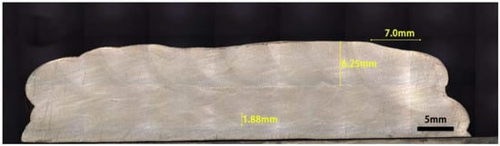 The metal-cored wire was designed by authors. The diameter of the wire is 1.2 mm and filling rate is about 15%. They are not seamless wires. The dimension of the steel sheath (99.6%) outside is 12 mm × 0.5 mm. The flux inside is metal particles. The formation process of wires included four steps: U-groove pressing formation, flux filling, rolling sealing and diameter reduction [25]. The multi-pass deposited metals were prepared by tungsten inert gas (TIG) welding process with 100% Ar shielding gas. The welding current and welding voltage were 190 A and 15–17 V, respectively. The travel speed kept in 280–300 mm/min. The inter-pass temperature was ~150 °C. The width and height of welding bead are ~7 mm and 6.25 mm. The height of each layer of deposited metals is ~1.88 mm. The total height of deposited metal is about 15 mm, ensuring that all samples are machined from deposited metal. The length of deposited metals is 300 mm (Figure 1). The chemical compositions of deposited metal measured by Optical Emission Spectrometer DF-100 are introduced in Table 1. The deposited metals are named as Cu 0.62, Cu 1.38, Cu 1.79 and Cu 2.32.