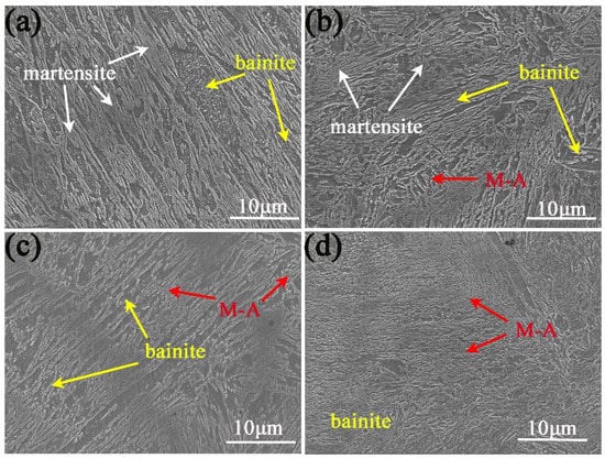 The mechanical properties of materials strongly depend on the microstructural features. To acquire the deposited metals with good strength and satisfactory toughness, the suitable microstructure is multiphase consisted of bainite, martensite and residual austenite (RA) [8,9,10,11]. Among them, the bainite and RA was designed to improve the toughness, and martensite was used to maintain high strength of deposited metals. Compared with martensite, bainite and RA are soft phase, which can coordinate stress during deformation and effectively improve toughness. The RA also can improve toughness of materials through transformation-induced plasticity (TRIP) effect [12]. Martensite usually exists as massive martensite and martensite-austenite(M-A) constituents due to incompletion of bainite transformation, which is considered to be detrimental to toughness [13].