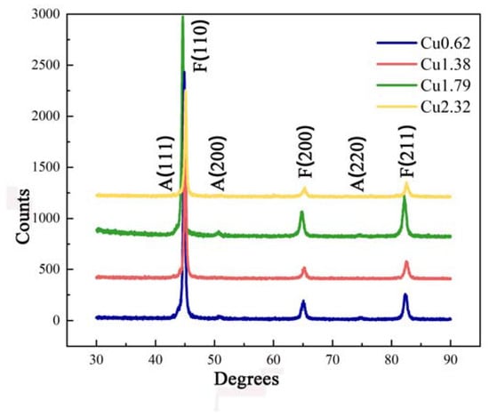 There is multiphase microstructure of deposited metals, consisting of bainite, martensite, martensite-austenite (M-A) constituents, and residual austenite (RA) (Figure 2 and Figure 3). The white lumps and granules dispersed in matrix are believed as massive martensite and M-A constituents. The microstructure of Cu 0.62 are bainite and massive martensite (Figure 2a). The shape of martensite changes from massive to banded of Cu 1.38 and Cu 1.79. The area fractions of martensite calculated via Image Pro software are reduced to 29.7% and 28.1%, which is about 32.2% of Cu 0.62. The martensite and M-A constituents are in shape of short rod of Cu 2.32. The area fraction of martensite and M-A constituents is total 27.2%. The volume fraction of residual austenite (RA) of deposited metals calculated by XRD are 4.01% (Cu 0.62), 6.18% (Cu 1.38), 11.12% (Cu 1.79), and 6.45% (Cu 2.32), respectively (Figure 3). The dislocation density of deposited metals is 2.18 × 1014 m−2 (Cu 0.62), 2.48 × 1014 m−2 (Cu 1.38), 2.24 × 1014 m−2 (Cu 1.79) and 5.10 × 1013 m−2 (Cu 2.32), respectively.
