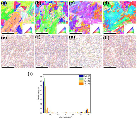 From the crystallographic morphology observed by EBSD, the microstructure of deposited metals is lath structure (Figure 4a–d). The characteristics of the laths is anisotropic. The grain boundaries with 2–5°, 5–15°and 15–180° are represented as red, green and blue lines, respectively (Figure 4e–h). The high angle grain boundaries (>15°) are the boundaries of laths, and the small angle grain boundaries are within laths. The area fractions of high angle grain boundaries are 17.38% (Cu 0.62), 18.24% (Cu 1.38), 23.54% (Cu 1.79), and 19.60% (Cu 2.32), respectively (Figure 4i).