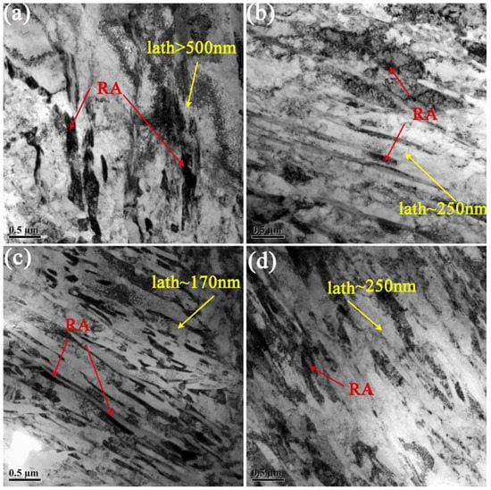 The microstructure of deposited metals is also observed by TEM (Figure 5). The lath structure with the width >500 nm of Cu 0.62 is inhomogeneous. When Cu content increases, the characteristics of lath become clear and the width decrease from 500 nm to ~170 nm. Cu addition induces the formation of submicrometer-sized lath structure. The average width of lath structure in Cu 1.79 is ~170 nm, which is the minimum (Figure 5c). The RA (~100 to ~200 nm) exists as film between laths (Figure 6). The orientation relationship between RA and α-Fe matrix computed by selected area electron diffraction (SAED) is consistent with the Kurdjumov-Sachs (K-S) orientation [28]: [110] γ//[100] α and () γ//(011) α. With the increase of 0.62–1.79% Cu addition, the area fraction of RA increases and its distribution becomes dense. As for Cu 2.32, the area fraction of RA decreases.