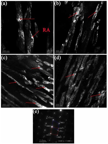 TEM dark-field of RA in deposited metals. (a) Cu 0.62, (b) Cu 1.38, (c) Cu 1.79, (d) Cu 2.32, (e) SAED images of RA and matrix, meaning the relationship between them is the Kurdjumov-Sachs (K-S) orientation.