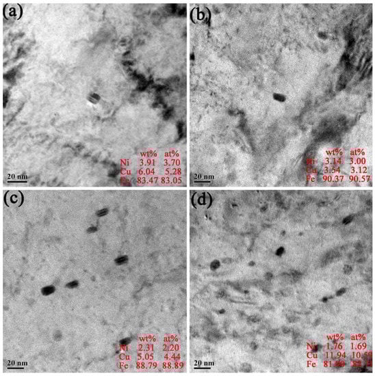 TEM morphologies and components by EDS of Cu precipitates. (a) Cu 0.62, (b) Cu 1.38, (c) Cu 1.79, (d) Cu 2.32. The black ellipse precipitates are Cu precipitation.