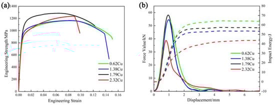 Mechanical properties of deposited metals. (a) Engineering strength-strain curves. The Cu 1.79 obtains the maximum strength value. (b) The Charpy V-Notch impact load curves (solid lines) and impact energy curves (dotted lines).