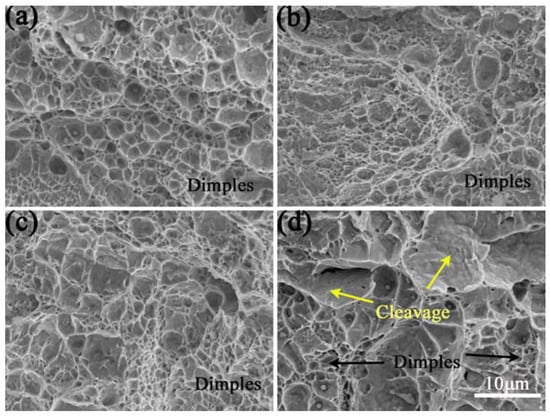The feature of impact fracture is mainly dimple, indicating ductile fracture of Cu 0.62, Cu 1.38, and Cu 1.79 (Figure 9a–c). The fracture characteristics of Cu 2.32 shows in quasi-cleavage fracture, exhibiting fine dimples together with cleavage (Figure 9d). The fracture feature of deposited metals is closely related to the amount, size and species of Cu precipitates, because precipitates act as nucleating site of crack during fracture.