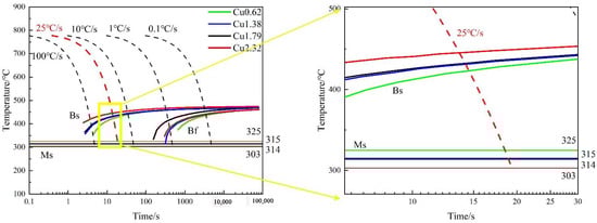 The effect of Cu element on the phase transformation temperature of deposited metal was simulated by JMatPro software (Figure 10). The start temperature of bainite (Bs) of deposited metals are 424 °C (Cu 0.62), 432 °C (Cu 1.38), 433 °C (Cu 1.79), and 446 °C (Cu 2.32) at a cooling rate of 25 °C/s. The difference values (Δ) of Bs and Ms point increases from 372 K to 416 K with increase of Cu addition. This indicates that Cu addition encourages the transformation amount of bainite during welding. Due to quick cooling rate in the welding process, bainite transformation is not complete. The subsequent cooling below Ms point will stimulate the formation of RA, martensite, and M-A constituents. Thus, the microstructure of deposited metal is modified from bainite and massive martensite to bainite and M-A constituent as the addition of Cu increase from 0.62% to 2.32%.