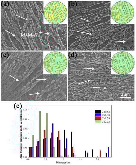 High-magnification SEM morphologies with schematic diagram (a–d) and equivalent diameter distribution of martensite and M-A constituents (e). (a) Cu 0.62, (b) Cu 1.38, (c) Cu 1.79, (d) Cu 2.32. The area fraction and size of martensite and M-A constituents of deposited metals decreases with increase of Cu addition.