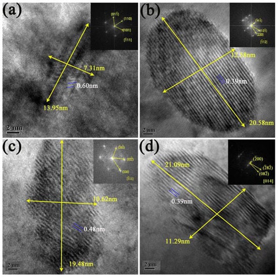 The HRTEM results show that Cu precipitates in deposited metals exist as BCC and FCC structure. With increase of Cu content, the fraction and diameter of Cu precipitates increases significantly (Figure 12). The Cu precipitates do not precipitate from the austenite, because Cu has a high solubility in austenite [30,31]. As the deposited metal transforms from austenite into α-Fe, the solubility of Cu decreases dramatically. Then, the Cu particles precipitates. The crystal structure of Cu precipitates in Cu 0.62 is BCC (Figure 12a). The spacing between every three atomic layers is 0.60 nm. The mismatch degree between BCC Cu precipitates and α-Fe matrix is 1.22%, confirming the coherent relationship. The crystal structures of Cu precipitates in Cu 1.38, Cu 1.79, and Cu 2.32 are both FCC with distance between every atomic layer of 0.39 nm, 0.48 nm, and 0.39 nm, respectively (Figure 12b–d). The FCC Cu precipitates lose their coherency with α-Fe matrix and grow longitudinally, revealing a shape of ellipsoid. The aspect ratio (length/width) of Cu precipitates are 1.63 (Cu 1.38), 1.83 (Cu 1.79) and 1.87 (Cu 2.32), increasing with increase of Cu addition.