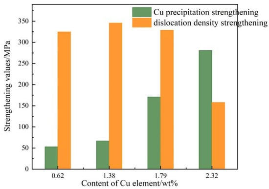 The contributions of two kinds strengthening mechanisms to yield strength of deposited metals are shown in Figure 13. The Cu precipitates can effectively improve the yield strength of deposited metals, and the maximum values of precipitation strengthening can reach 281 MPa. Because the dispersion of Cu precipitates in deposited metals can serve as effective barriers for dislocation movement. At the same time, the effect of dislocation density enhancement of Cu 0.62, Cu 1.38, and Cu 1.79 is similar, but the dislocation density of Cu 2.32 reduce obviously, leading to dislocation strengthening value decreases by half. The Cu 1.79 obtains the best yield strength. Because the dislocation density of it remains at a high level, and Cu precipitation provides 171 MPa strengthening.