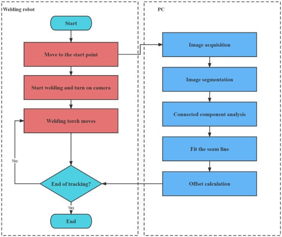 In this paper, semantic segmentation is used to obtain the positions of the arc and seam. The main idea is to use multi-category semantic segmentation to determine the positions of the welding seam and the arc according to the image features of different parts in welding scene, and to calculate the offset between them. The overall flow chart of the welding seam tracking is shown in Figure 3.