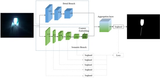 The structure of BiseNetV2 is mainly composed of three parts: the detailed branch, semantic branch, and aggregation layer. The first two parts belong to the backbone part, and the aggregation layer is used to fuse the features extracted by these two branches. The specific network structure is shown in Figure 4.