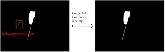 After image segmentation, the semantic image needs to be post-processed to reduce the calculation error of the offset. During the training process of the semantic segmentation network, the convergence value of its parameters cannot fit all data samples, which will result in unsatisfactory segmentation of some images. Some segmented images are shown in Figure 5. It can be seen that since the arc part has obvious features and occupies a large proportion of the number of pixels, the segmentation of the arc part is relatively stable. In contrast, the brightness of the seam part is lower and the geometric features are not obvious, so mis-segmentation of the seam part is more likely to occur. Although we have thickened the line width of the seam portion of the label trained in the network, it is still impossible to completely avoid the mis-segmentation of the seam. To solve this problem, we adopt an image processing method based on the connected component analysis. Taking Figure 5 as an example, the upper edge of the groove portion is identified as the seam due to the similarity of the geometric features to the seam under low brightness. After analyzing the pixel distribution, it is found that the number of pixels in the mis-segmentation part is mostly discontinuous, and only the real seam part is more continuous. Based on this geometric feature, the connected domains in the image can be labeled, and the pixel score of each connected domain can be calculated. We select the connected domain with the highest score from all connected domains, mark it as the seam part, and set the pixel gray value for the rest of the connected domains to zero, as shown in Figure 6.