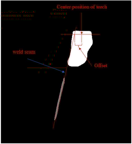During the welding process, the industrial camera is fixed on the welding torch, and the relative positions of the camera and the welding torch remain unchanged. Therefore, when calculating the offset between the welding seam and the welding torch, it is not necessary to convert the information from two-dimensional to three-dimensional, and it is only necessary to calculate the mapping relationship between the offset in the image and the actual offset. In the experiments, the field of view of the camera is small, and the calculation part is roughly in the center of the image, so the influence of the image distortion can be ignored. Due to the relative stillness of the camera and the welding torch, the pixel size can be measured as 0.06 mm/pixel by placing a ruler in the welding area.