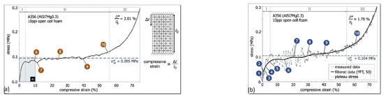 Metal foams are cellular solids composed of a solid and a gas phase. A first classification can be performed on the basis of their porosity: open or closed. The main difference is the presence or absence, respectively, of pore interconnections. The main properties of metal foams are their low density [1,2,3], high energy absorption in compression [4,5] and crash tests [6,7], high acoustic [8] and vibration [9] absorption, high heat transfer coefficient [10], and high electrical [11] and thermal [12] conductivity. The mechanical behavior is strictly related to the morphology of the porosity [13] and consequently to their production methods [14]. Due to their low density, weight reduction of up to a maximum of 80% can be achieved with respect to the same volume of conventional metals [1,6]. This feature makes them interesting in industrial fields, where lower weights lead to lower fuel consumption, such as in the automotive, aerospace, and naval fields. With respect to mechanical strength, the analysis and comparison must be considered on the basis of weight units, and metal foams demonstrate excellent behavior in compression tests. An interesting feature of open cell foam is its high heat exchange coefficient, thanks to its high surface/volume ratio. One of the most important structural features of metallic foams is their relative density (ρ*/ρo), which is the ratio of the density of the foam to the density of the solid. In general, metal foams can easily reach relative densities lower than 0.3. Gibson and Ashby [15] analyzed the properties of cellular materials with respect to the way in which the solid was distributed in the cell faces and edges. They described the topological laws governing the shape and size of the cells, and then the equations describing the relationship between the density and the cell wall thickness and length were developed for cellular solids. Below, the formulas for the correlation between relative density and different type of cells are reported for three-dimensional open cells (aspect ratio Ar = h/l). The relationship between relative density and mechanical properties has also been studied by Gibson and Ashby [15], Bin et al. [16], and Jing et al. [17]. Another feature of metal foams is their ability to absorb energy during compression, and a typical graph (stress–strain), displayed in Figure 1 [4], indicates a starting step exhibiting pseudoelastic behavior, a second plateau step in which the average stress remains constant and the cavities begin to collapse, followed by a third step in which foam densification leads to a rapid increase in stress. On the basis of an analysis of the area under the curve, it can be observed that cellular materials are capable of high energy absorption, both for static and for dynamic loads.
