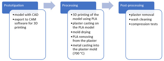Al 6082 alloy was the base material selected for the manufacturing of the foams using the modified investment casting technique. The production process was inspired by an ancient technique called “lost wax”. Specifically, in this method, a wax model was created and covered with a clay mold with holes that would allow the wax to come out. When subjected to heating, the clay would become terracotta, and the wax model would come out of the cavities, forming the negative shape of the object, which would subsequently be used to cast the bronze. The process consists of the following main steps: build-up the model using 3D CAD; export to CAM software (Ultimaker Cura 3.0, Utrecht, The Netherlands) for 3D printing; 3D print the model using PLA; plaster cast the PLA model; mold drying; removal of PLA from the plaster; cast the metal in the plaster mold; remove the plaster to obtain the foam. A scheme of the process is showed in Figure 2.