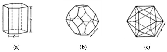 (a) Hexagonal with rectangular cell; (b) Truncated octahedron; (c) Icosahedron.