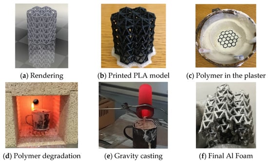 After creating the CAD model and generating the STL file for the 3D Ultimaker S3 printer, the model was printed using black PLA. The printing process also required the parameters to be defined (printing speed = 45–60 mm/s; layer height = 0.3–1.0 mm, initial layer height 0.15–0.50 mm, support generation and lower base in natural PVA). The number of layers is a function of the layer height parameter, which was chosen as a compromise between the time required for printing and the desired precision of the PLA model, in such a way as to avoid the defect known as “shifted layer”. Moreover, the use of a PVA base insertion allows the simpler removal of some parts, because it is water soluble, without the risk of damaging the prototype. As a result, there was a lower mass of polymer needing to be removed from the mold. After printing, the PLA model was placed into an AISI 316 mold. The mold was built up by pouring a mixture of dental plaster and water (3:1) over the PLA model, which was subsequently allowed to dry in air for 15–20 min and then placed in an oven at 750 °C to degrade the polymer. Three types of plaster were used: alabaster plaster, type 4 dental plaster, and plaster of Paris. Once the polymer was eliminated, the Al alloy was poured using gravity to build the final foam model. EN 6082 (AlSi1MgMn) alloy was used for casting. In a final step, the samples were cleaned by water jet to remove any residual investment. The different steps of the foam production process are illustrated in Figure 6.