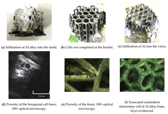 Main defects in Al alloy open foam. (a) Al infiltration; (b) cells not completed; (c) infiltration of Al in the vents; (d,e) porosity of hexagonal cell foam; (f) layer evidenced in truncated octahedron elementary cell Al alloy foam.