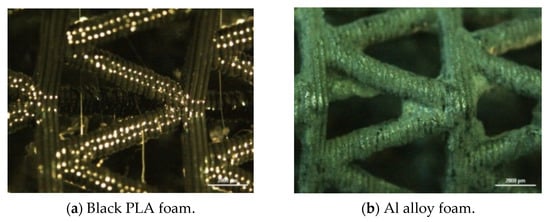 Stereo microscope observations: (a) black PLA foam; (b) Al alloy foam.