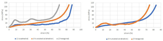 Stress–strain curves for icosahedral (1), hexagonal (2), hexagonal (3) and truncated octahedron (4).