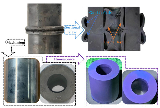 GH4065A alloy IFW joints had complete flash, the outside flash was turned 0.2 mm, the inside flash was turned 1.5 mm. The fluorescent flaw detection results after acetone cleaning showed that the joint had no cracks, as shown in Figure 1.