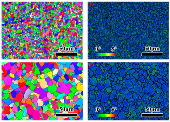 Figure 6a,b shows the IPF and KAM maps of the TMAZ of the GH4065A alloy. Due to the increase in temperature, the plastic flow of the metal is more sufficient, and the dynamic softening mechanism is fully activated, which promotes the complete DRX of the “fibrous structure” and the original equiaxed grain structure to form a new undistorted equiaxed fine grain, the average grain size reaches 3.9 μm. Figure 6c,d shows the IPF and KAM maps of the WZ. The metal plastic deformation in the zone is higher, the thermal influence caused by high temperature is more severe, and the strengthening phase in the WZ is basically completely dissolved [15,32]. As a result, the grain boundary migration rate is gradually accelerated, and the newly recrystallized grains grow rapidly and coarsen. The average grain size reaches 10.16 μm.