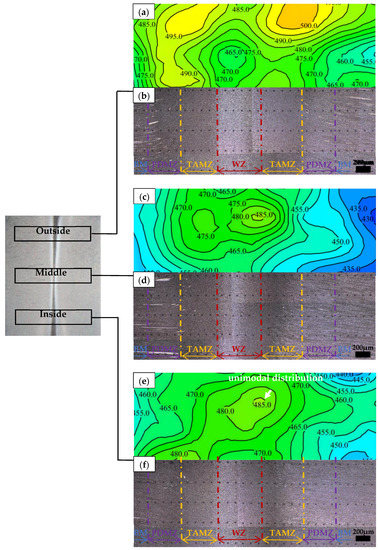 Microhardness distribution in different zones of GH4065A alloy IFW joints. (a,b) Outside contour map and microstructure map, (c,d) Middle contour map and microstructure maps, (e,f) Inside contour map and microstructure maps.