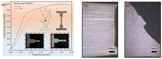 (a) Stress−strain curve of GH4065A alloy IFW joints at RT and 750 °C, (b) Microstructure of IFW joint fractured at RT, (c) Microstructure of IFW joints fractured at 750 °C.