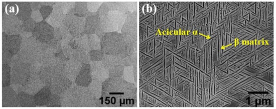 The starting material Ti-45551 was supplied by China Western Superconducting Technologies company, the β-transus was measured using the metallographic method at 805 °C. Solution treatment (870 °C/1 h/AC) followed by aging treatment (510 °C/4 h/AC) was carried out before welding. This heat treatment procedure was an efficient method to obtain a balanced combination of strength and ductility. The microstructure exhibited a typical α/β structure (Figure 1), which consists of only an acicular α phase in the β matrix phase. The length of the acicular α is about 0.62 ± 0.24 μm, and the width of the acicular α is about 32.7 ± 7.6 nm (Figure 1b). The chemical composition (wt.%) of the alloy was analyzed by a direct-reading spectrometer and an ONH-HMC shown in Table 1. The preparation for EBW involved the following steps: (1) cutting a bulk sample into two plates (120 mm × 70 mm × 20 mm); (2) mechanically polishing the surfaces of the plates; and (3) cleaning the polished surfaces with acetone to remove any contaminations.