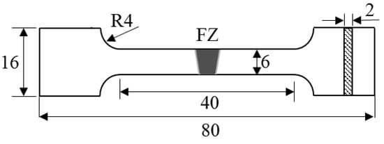 Tensile tests were carried out at room temperature using an electronic universal testing instrument (Instron 3382, INSTRON, Norwood, MA, USA) with a strain rate of 5 × 10−4 s−1. The dimensions of the tensile sample are shown in Figure 3. The weld is located in the middle of the sample. In order to ensure the accuracy of the data, three samples were tested under each condition. Vickers hardness was measured from the FZ to the BM on an automated Vickers hardness tester (LM248AT, LECO, Benton Harbor, MI, USA). The step length is 300 μm along the perpendicular direction of the weld with a 500 g load, 13 s dwell time.