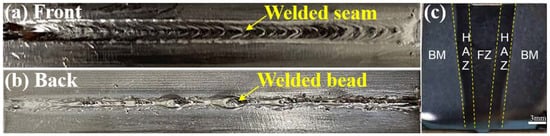 After welding, a welded seam was formed on the front of the weldment (Figure 4a), which was smooth without undercuts. Meanwhile, a welding beading was formed on the back of the weldment (Figure 4b), which illustrated that the weldment achieved a 100% welded penetration.